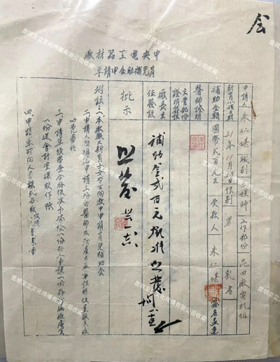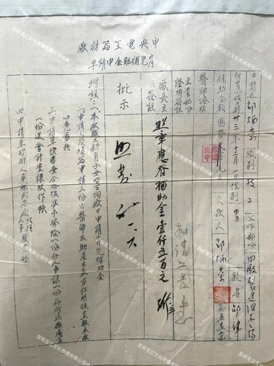 ▲1948年8月中央电工器材厂(昆明电缆集团前身)发放职工育儿补助金圆券20元。