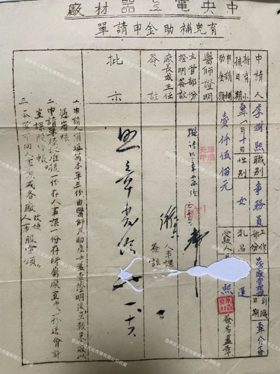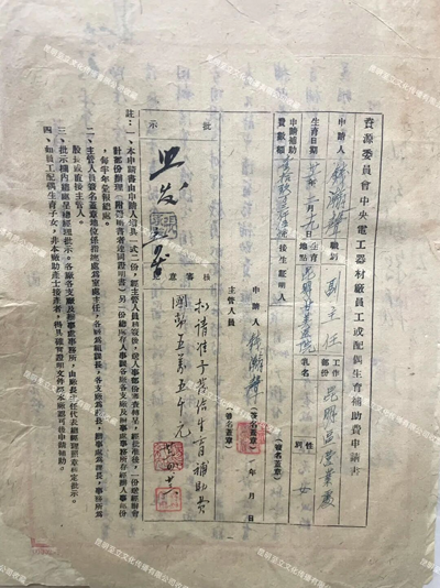 ▲1948年8月中央电工器材厂(昆明电缆集团前身)发放职工育儿补助金圆券20元。